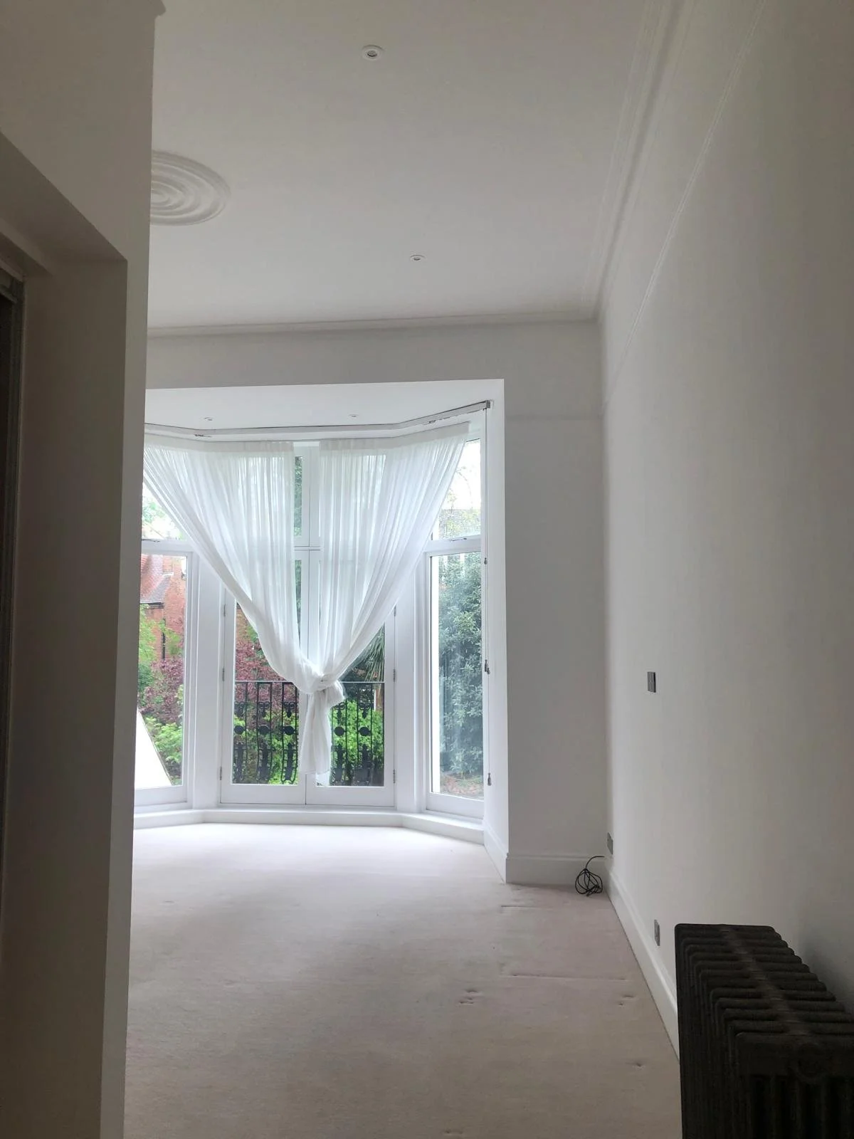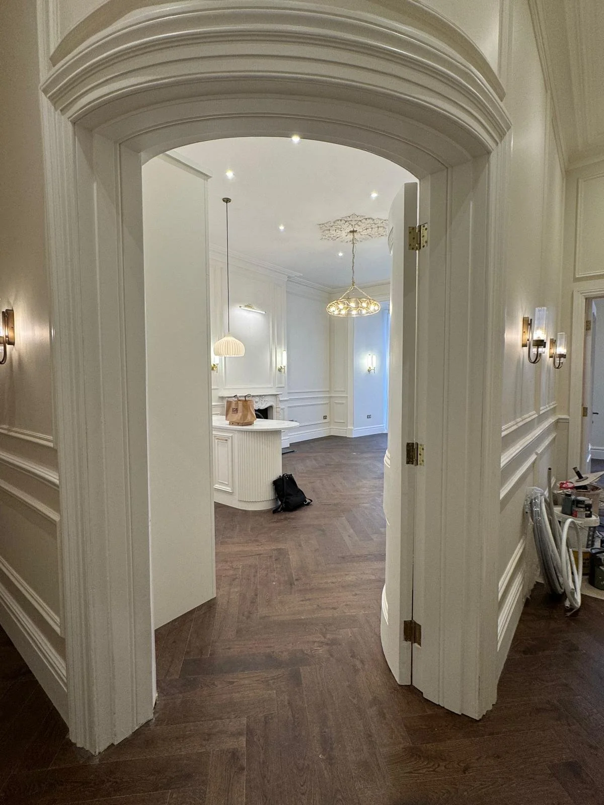 Set within a grand Georgian terrace in Belsize Park Gardens, this entrance-level apartment was reimagined to restore balance, proportion and flow. Over time, the flat had been awkwardly subdivided, with principal rooms repurposed and circulation compromised. Our redesign reinstated the logic and generosity of the original layout while tailoring it for contemporary living - transforming the front principal room into a calm master suite with bespoke joinery commissioned by the client and a refined ensuite, and the rear principal room into a light-filled living space centred around a curved, fluted kitchen island. Reinstated mouldings, layered lighting and crafted detailing bring coherence and warmth, celebrating the apartment’s elegant Georgian character.