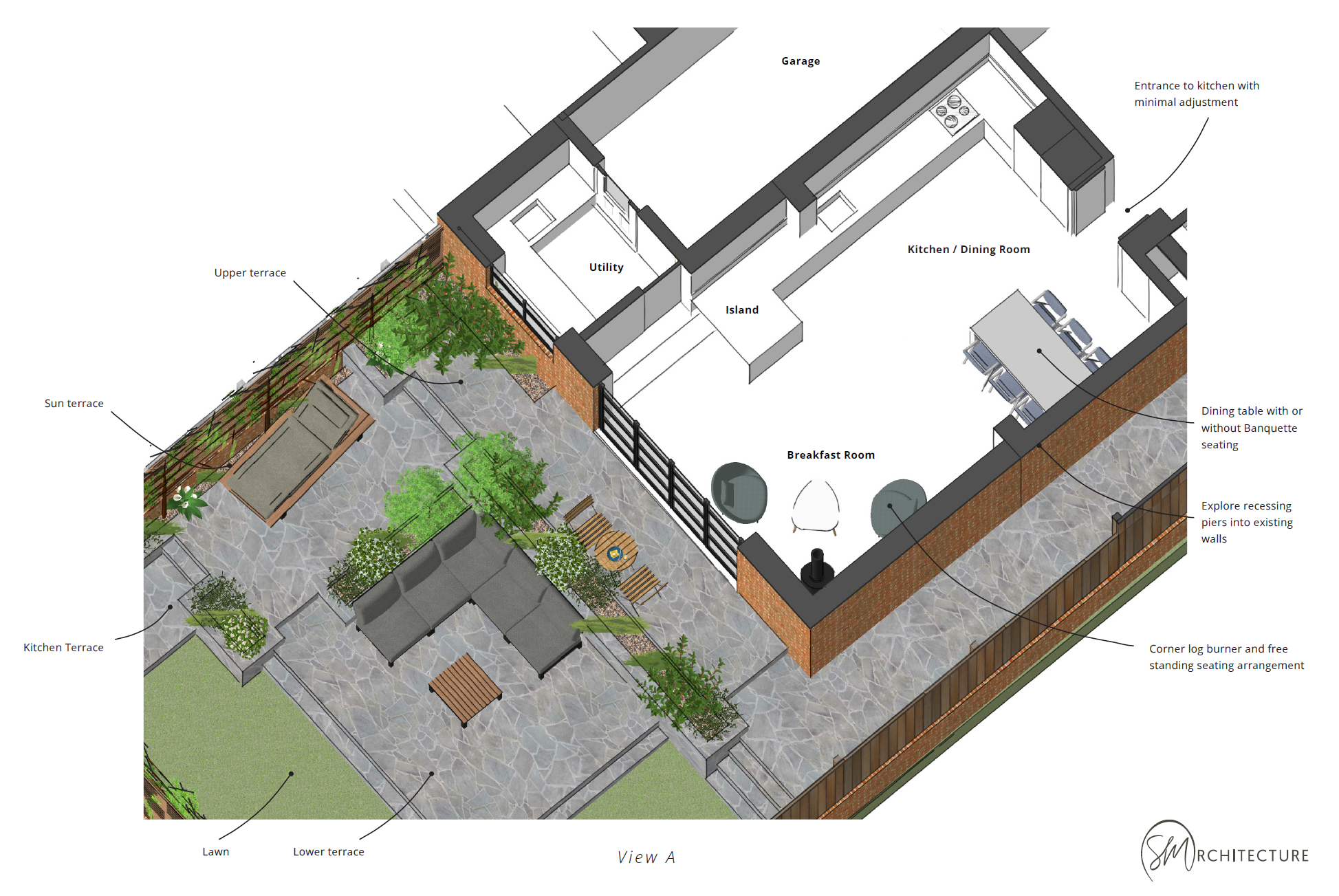 This full-width rear extension transforms a suburban home with an attached side garage, unifying the two elements into a single, cohesive form. The original garage projected into the garden beyond the rear elevation of the house, creating an uneven footprint and fragmented layout. The new extension rationalises the plan by adding a utility room behind the garage and an open-plan living area to the rear of the main house - forming a generous, connected family space.